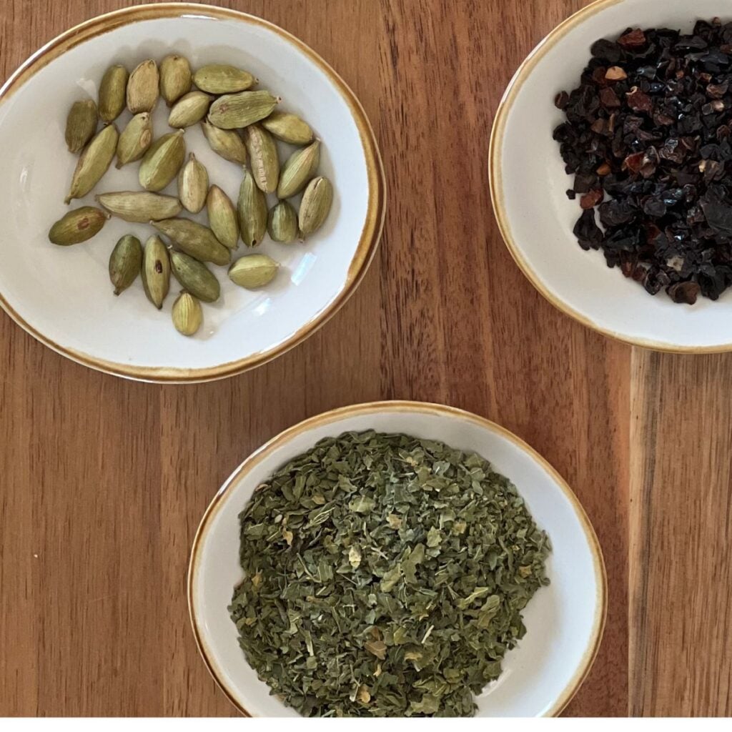 - Add the dandelion root, lemon balm, oatstraw, dried rose hips, and dried nettle to your small saucepan. Toss in the cardamom pods, lightly crushing them first with the back of a spoon to help release their warm, aromatic oils.