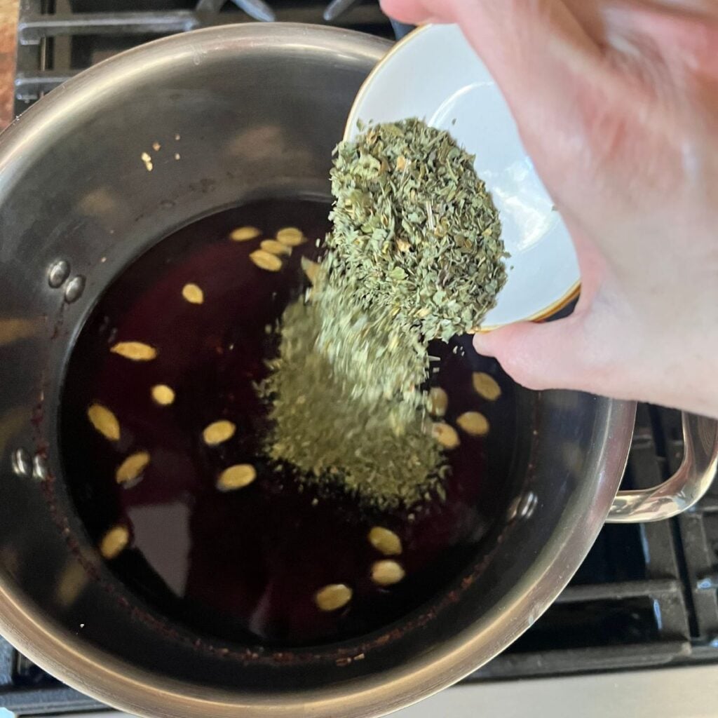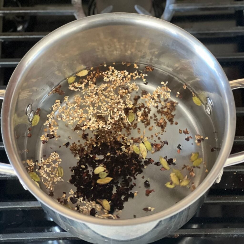 2. our in enough water to cover the herbs by about an inch. Bring to a gentle boil over medium heat, then reduce to a low simmer. Allow the herbs to simmer for 20–25 minutes, stirring occasionally. The liquid should deepen in color and take on a rich, earthy aroma.